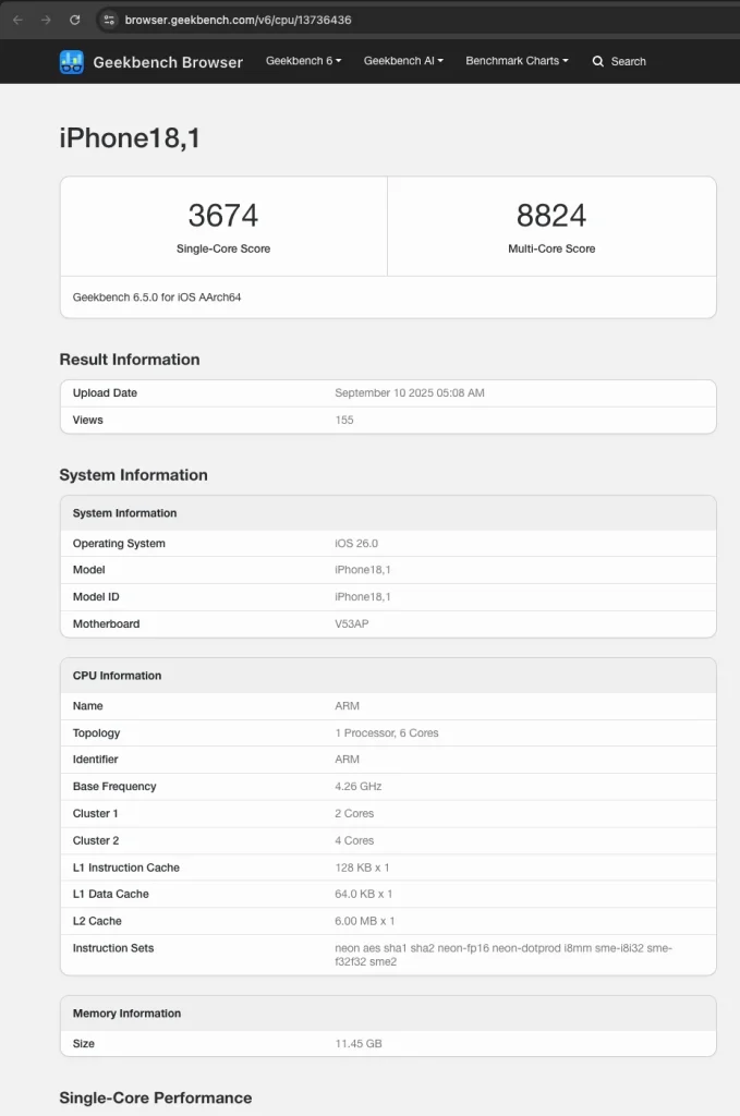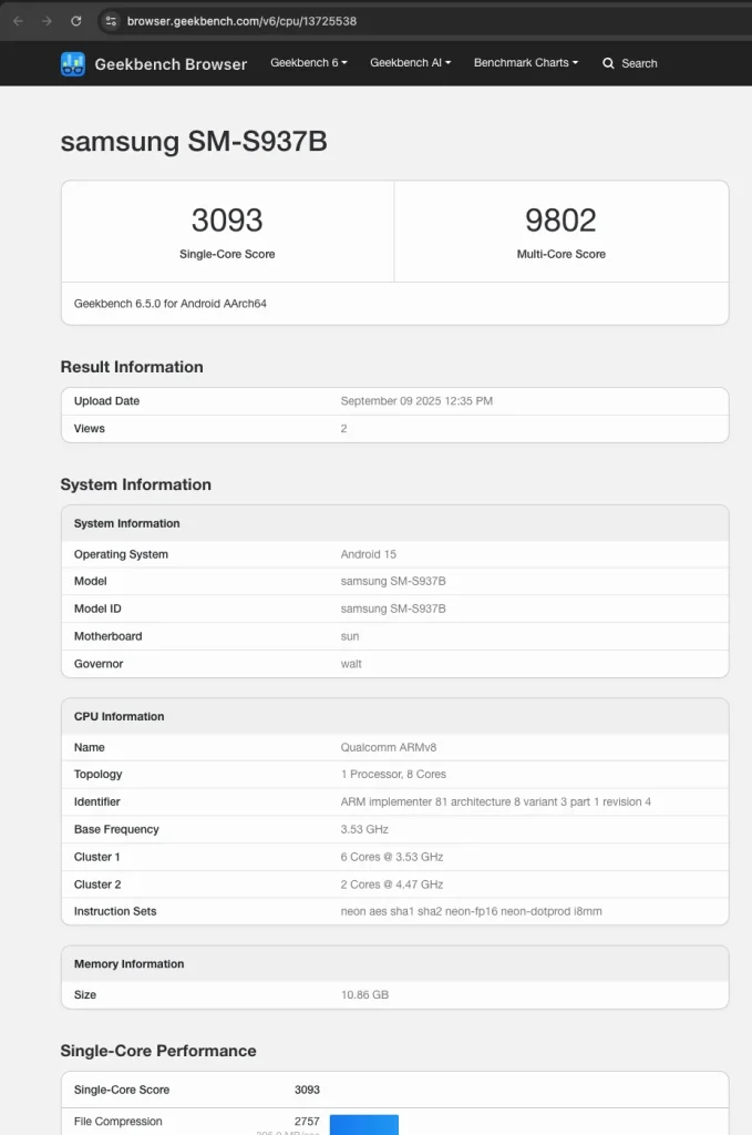 Prema Geekbench testovima, Apple-ov iPhone Air sa A19 Pro čipsetom ostvario je 3.674 poena u single-core testu, dok je u multi-core testu dobio 8.824 poena. Na drugoj strani, Galaxy S25 Edge sa Snapdragon 8 Elite čipom postiže 3.093 poena u single-core i 9.802 poena u multi-core testu.