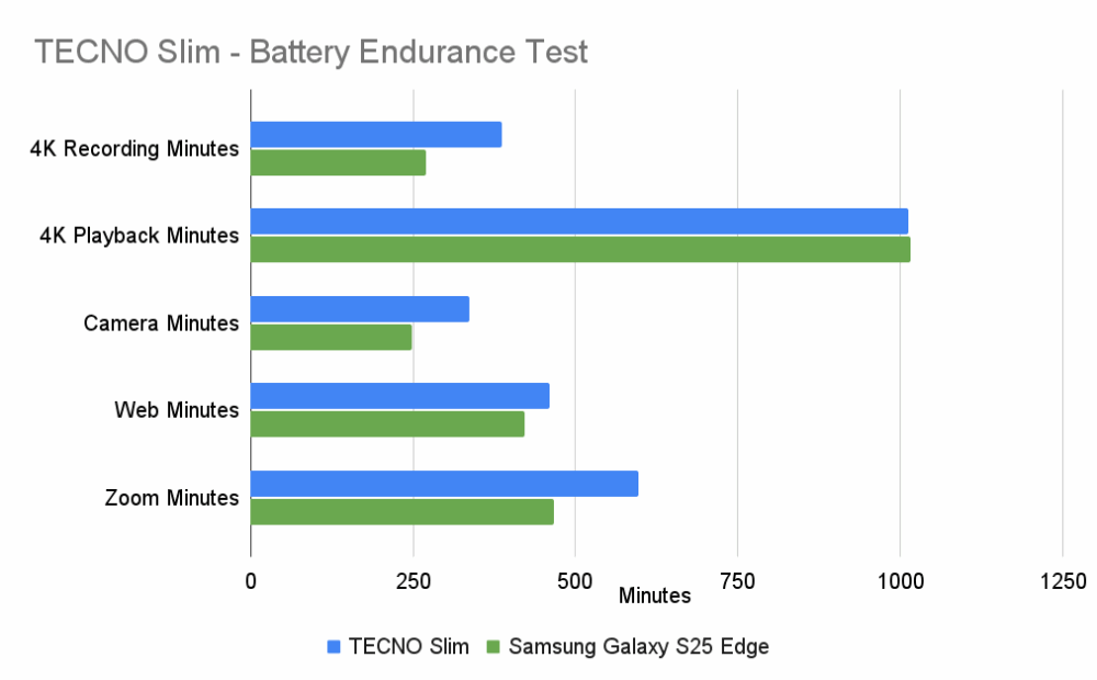 Dok Galaxy S25 Edge ima bateriju od 3.900mAh, TECNO Slim ide korak dalje sa kapacitetom od 5.160mAh. Zahvaljujući inovativnoj tehnologiji slaganja komponenti, TECNO je uspeo da u ultra-tanko kućište ubaci i veću bateriju i 0,3mm vapor chamber sistem hlađenja.