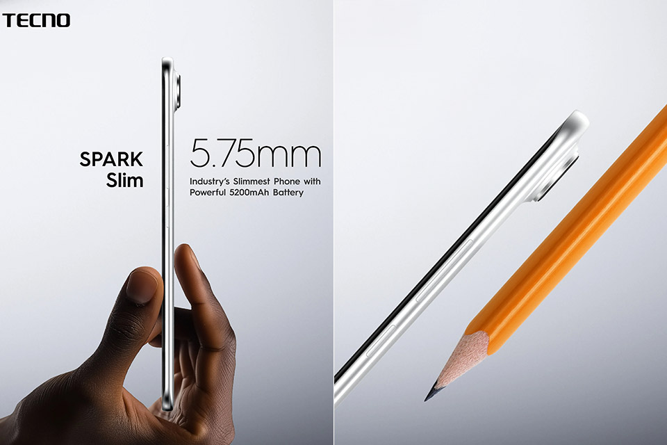 Tecno Spark Slim odlikuje se ultra-tankim profilom koji čini da konkurentski uređaji izgledaju glomazno. Iako je za sada u pitanju samo koncept, sa debljinom od samo 5,75 mm i težinom od 146 grama, jedan je od najlakših pametnih telefona ikada predstavljenih. Telefon ima zakrivljene ivice sa obe strane ekrana i zakrivljene strane gde se zadnji deo spaja sa srednjim okvirom, što doprinosi njegovom izuzetno tankom profilu.