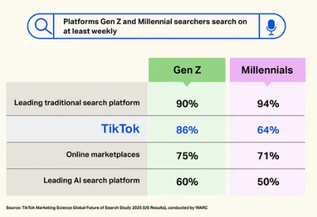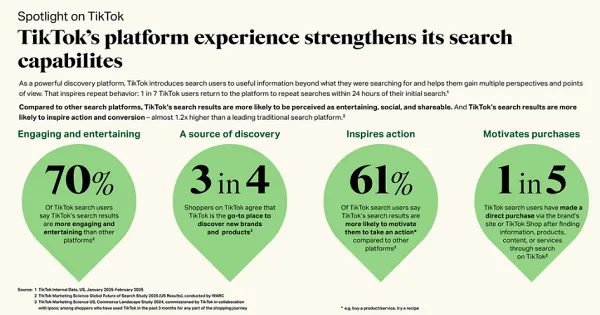 TikTok je uveo Search Ads još 2023. godine, a njihov potencijal sve više dolazi do izražaja. Kompanija navodi da se broj pretraga u aplikaciji povećao za 40% u odnosu na prethodnu godinu, dok korisnici svakodnevno izvrše milijarde pretraga. Istraživanje koje je sproveo WARC na uzorku od preko 1.000 američkih potrošača pokazuje da TikTok pretraga sada ozbiljno konkuriše Google‑u kao alat za otkrivanje novih proizvoda i sadržaja, naročito kod mlađe publike.