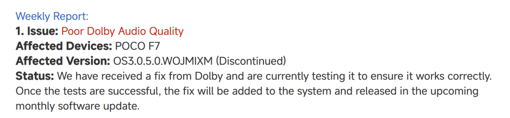Xiaomi je zvanično prihvatio i odgovorio na žalbe korisnika u vezi sa lošim kvalitetom Dolby Audio zvuka na modelu POCO F7, potvrdivši da je rešenje problema u pripremi. Kompanija je naglasila da se radi o softverskom problemu vezanom za specifičnu verziju HyperOS-a, a ne o hardverskom ograničenju uređaja.